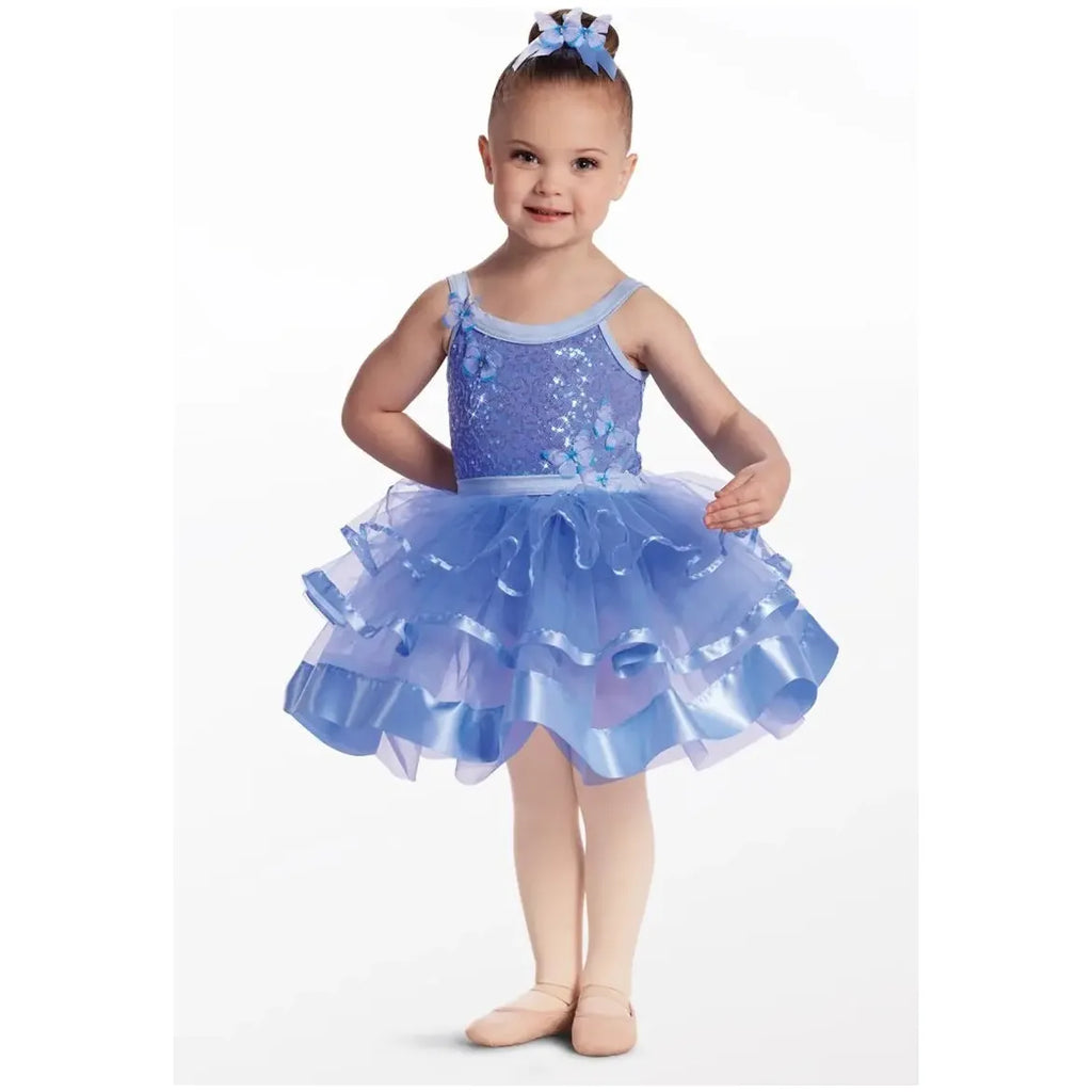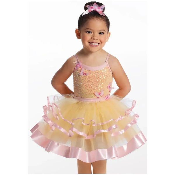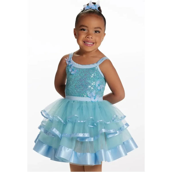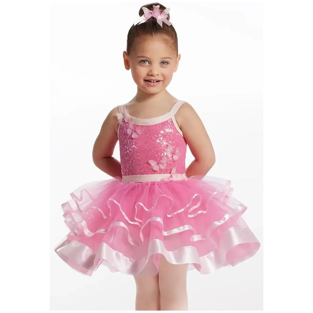 - 3D butterfly appliqués and shiny spandex bodice trim