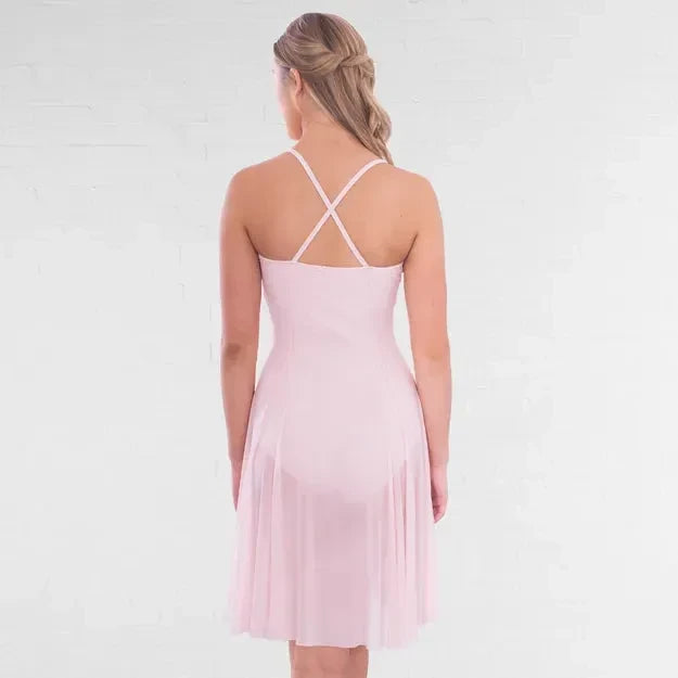 • Mesh dress overlay with flattering seam detail drapes over the leotard