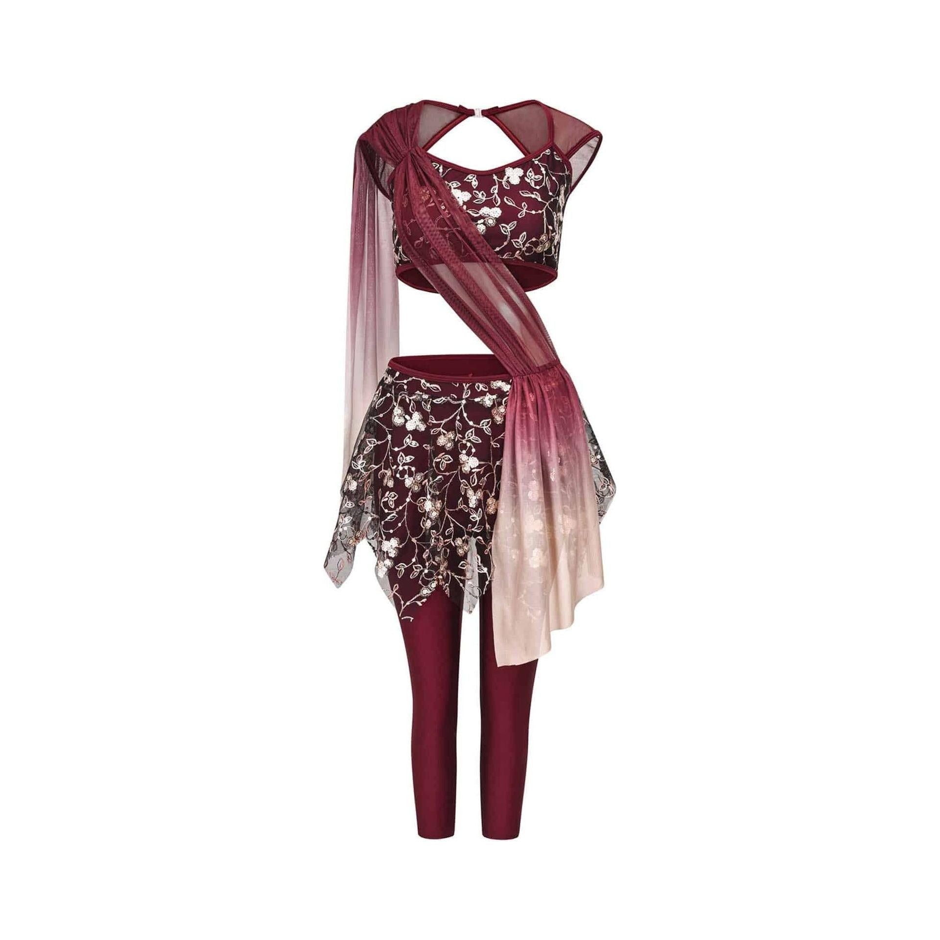 - Two-piece costume of crop top and leggings secured by a shoulder-to-hip wrap of burgundy ombre mesh